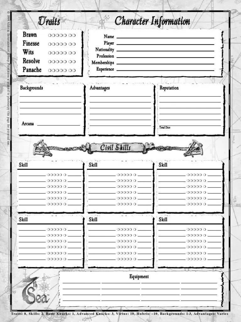 Below is a sample of the official 7th sea 2nd edition. Web this app is designed to help you create a character for the tabletop rpg 7th sea (second edition). Web 18 rows the 7th sea second edition role playing game by john wick and our 7th sea 2e community for. Character sheet, characters, game tool, fillable.