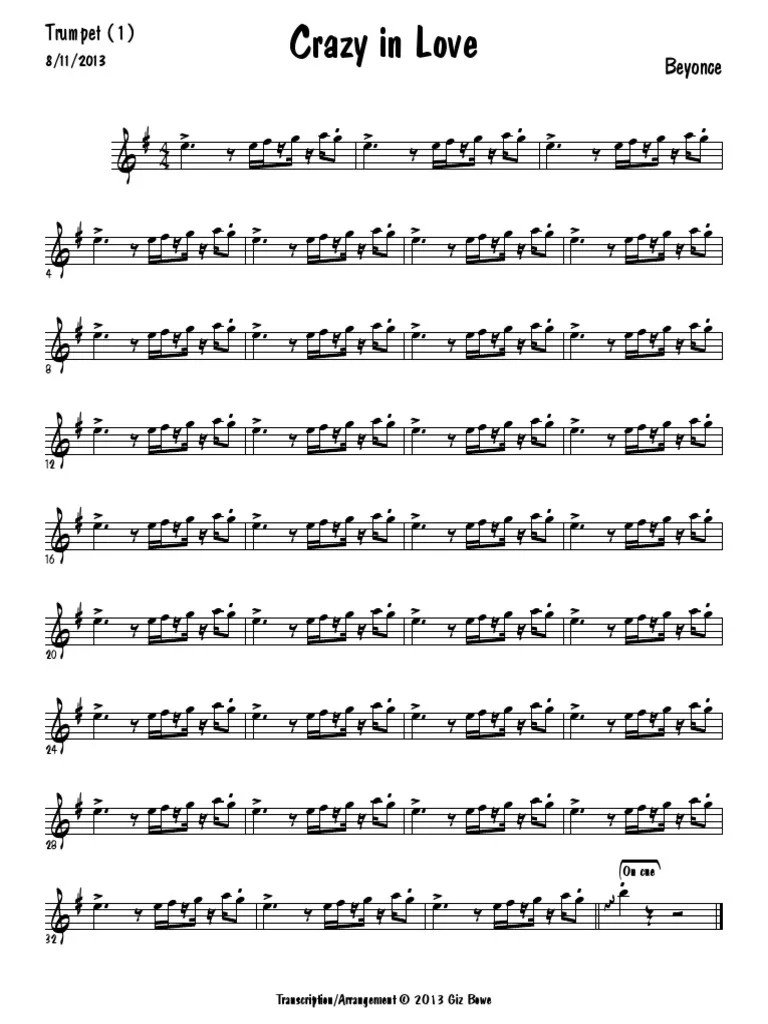 Crazy In Love Trumpet Sheet Music - Web words and music by eugene record, richard harrison, beyonce knowles, and sean carter / arr. 2 parts • 5 pages • 03:38 • aug 20, 2021 • 548.