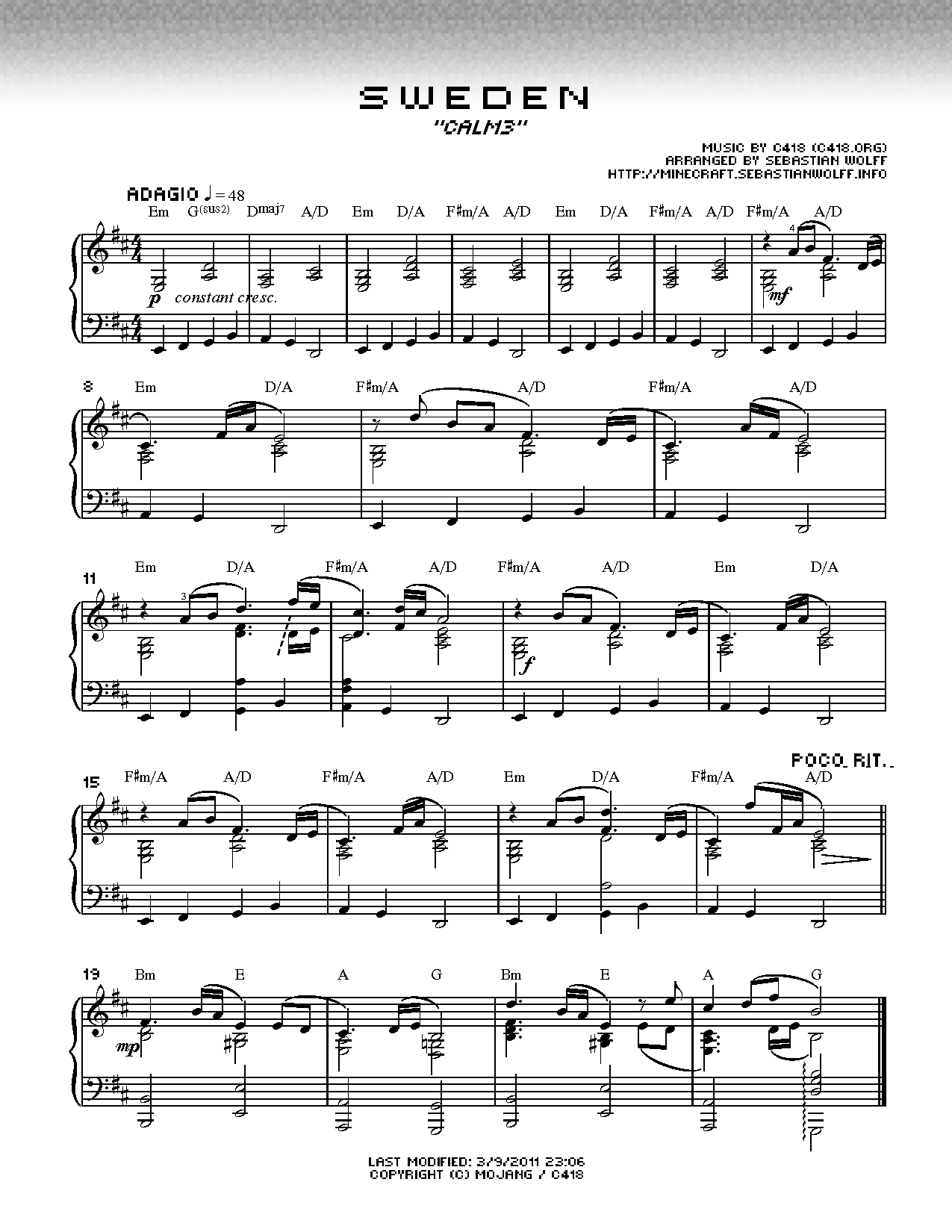 I've played minecraft like a billion times,. This is an intermediate song and. :) download and print in pdf or midi free sheet music for sweden by c418 arranged by torby brand for piano (solo) Web download sweden sheet music pdf minecraft. “sweden sheet music pdf minecraft” for piano sheet music, scoring piano solo , original key: Sweden sheet music from minecraft arranged for piano. Use your computer keyboard to play sweden (minecraft) music sheet on virtual piano. Web sweden (minecraft) is a song by c418. Web sweden (minecraft) both good versions. Instrumental solo, and piano/chords in e minor. I recommend people to learn this song.