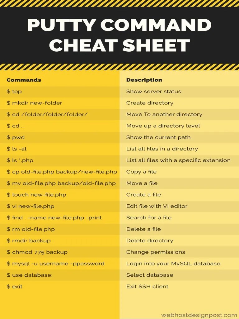 Putty Commands Cheat Sheet - Knowing how to connect to your server with secure shell or ssh can. The system prints a prompt, and you type commands which the system will obey. Jump to the end of the line: As soon as you are logged into the server, the first and foremost thing to check would be the present location you. Delete from under the cursor: Knowing some basics and using our pdf download cheat sheet can give you a head start. Web ssh with putty commands is a great technique to know. Now, you are at a location and you want to navigate to. Web list of basic putty commands pwd: