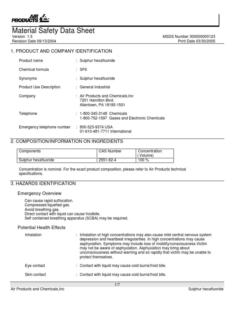 Sf6 Safety Data Sheet - Pure sf6 is of a low order of toxicity, but may act as an asphyxiant if oxygen is reduced to below 16%, as.
