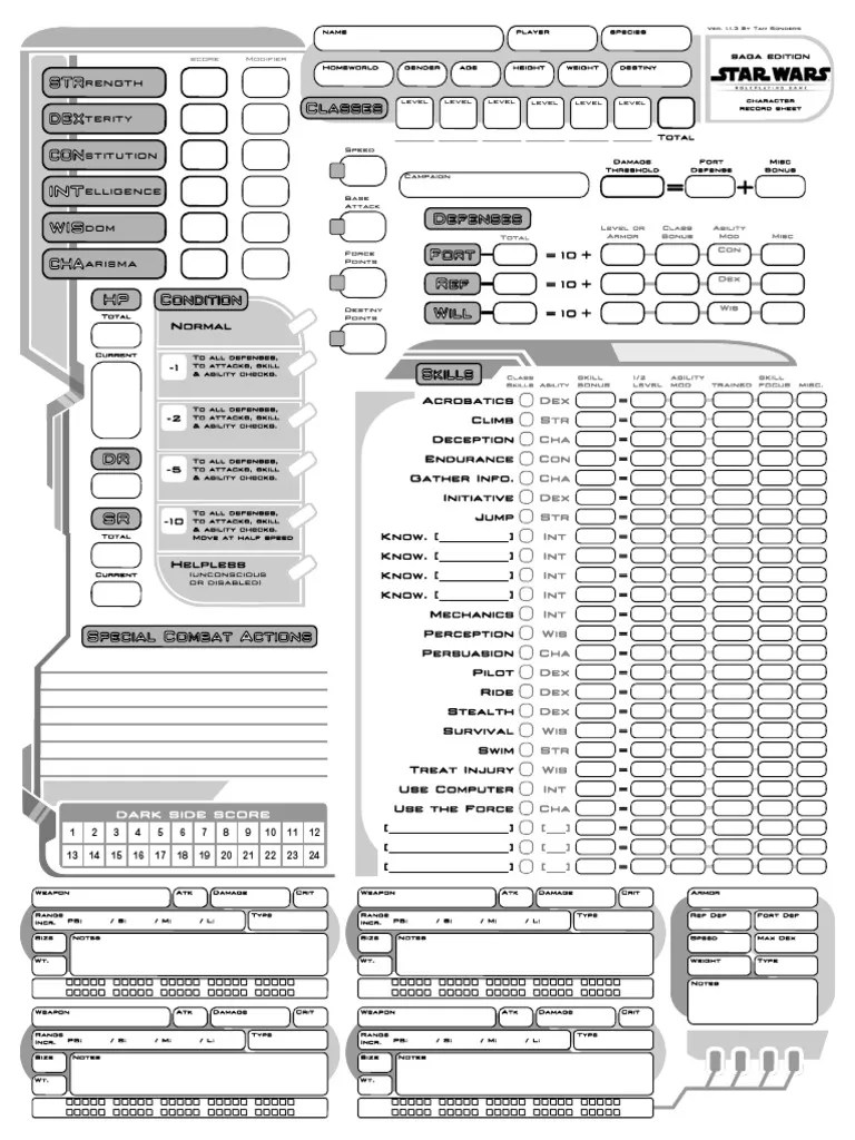 The layout is based on the character sheet by partick. Web i made this form fillable pdf character sheet for the star wars saga edition.